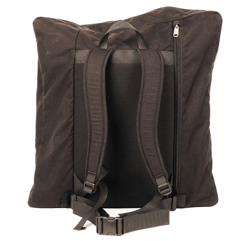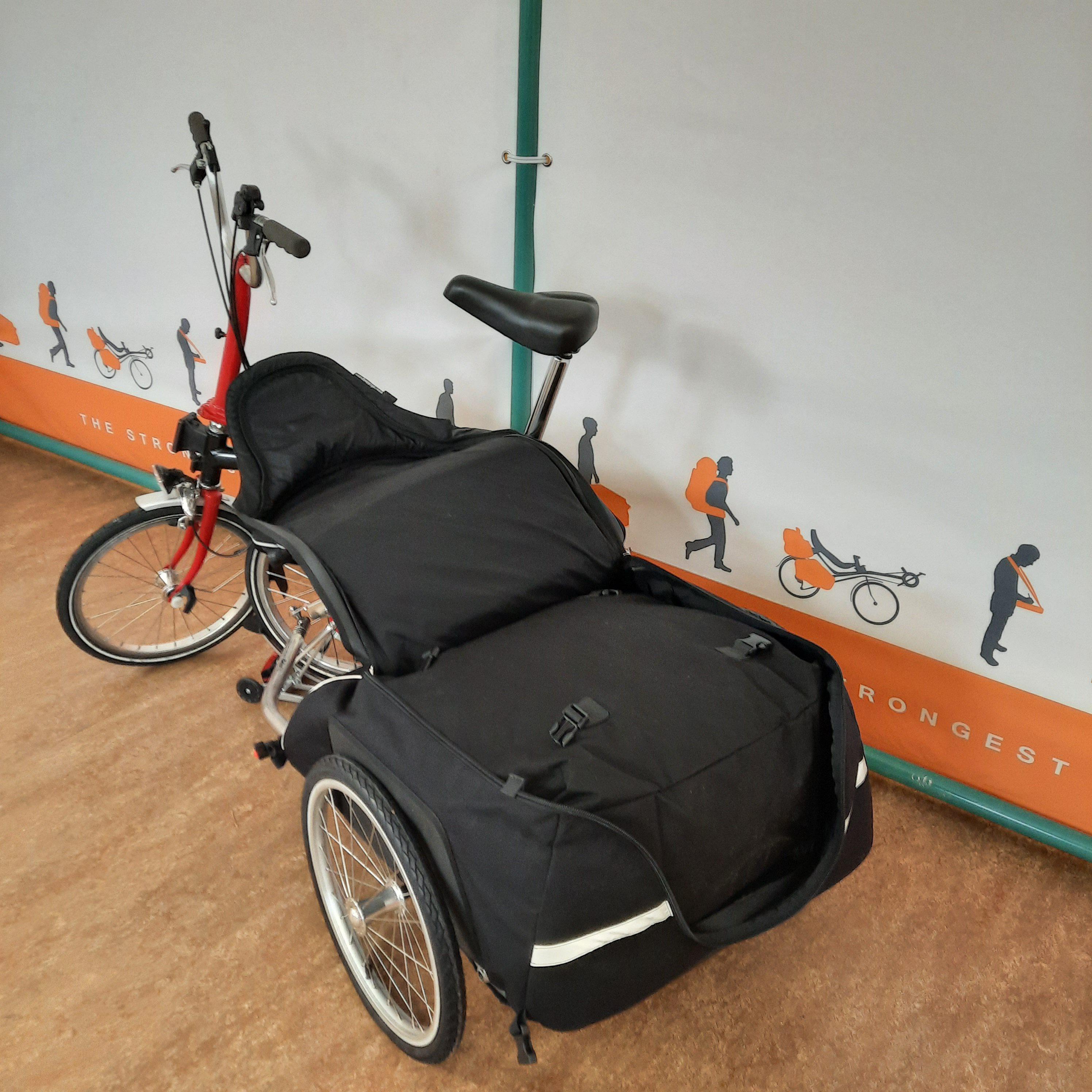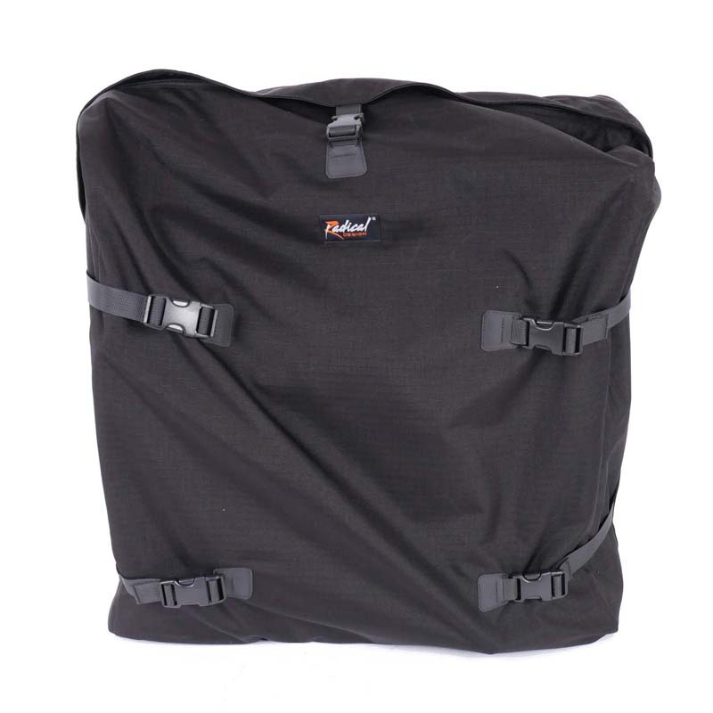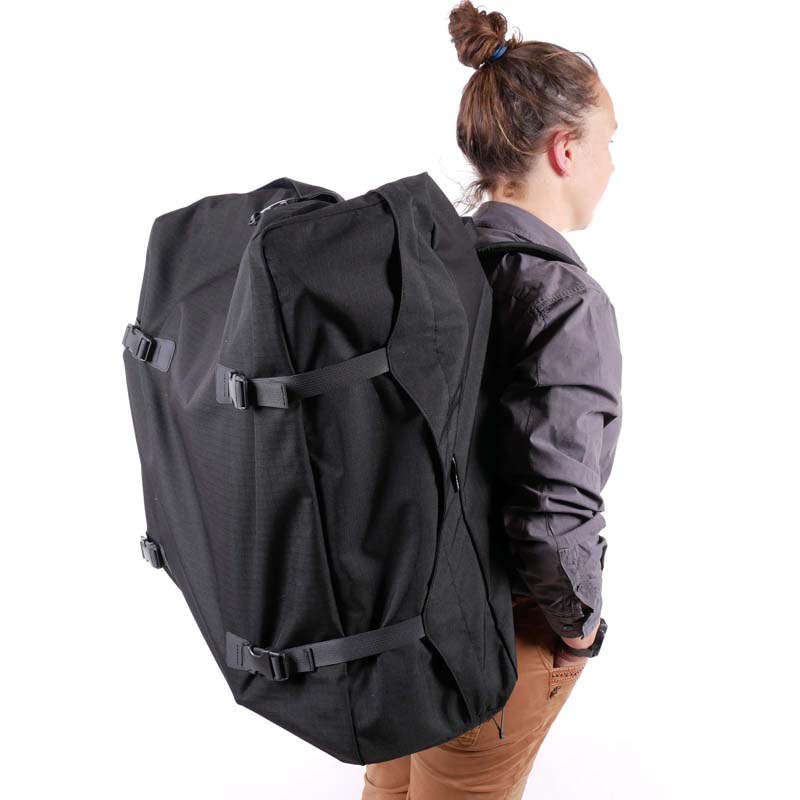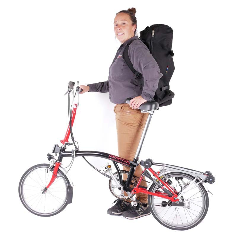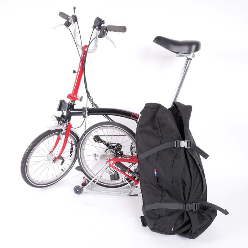 Je Brompton past volledig in de rugzak. Via de lange rits berg je de fiets eenvoudig op; met de gespen sluit je de tas veilig af. In sommige landen is het zelfs verplicht de vouwfiets in een tas mee te nemen in het openbaar vervoer.
