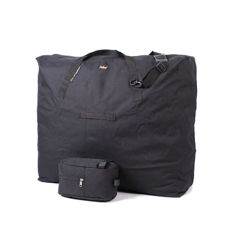 Uw Dahon vouwfiets (of andere 20" vouwfiets) past volledig in deze transporttas. In veel landen is dit verplicht in het openbaar vervoer. Als de fiets in de tas zit, kunt u hem dragen aan de stevige hengsels of met de meegeleverde schouderband. De transporttas wordt geleverd in een zadeltas.