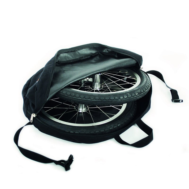 De ovale vorm zorgt ervoor dat beide wielen, inclusief assen, perfect in de tas passen. Ideaal tijdens vervoer of opslag van je fietskar.