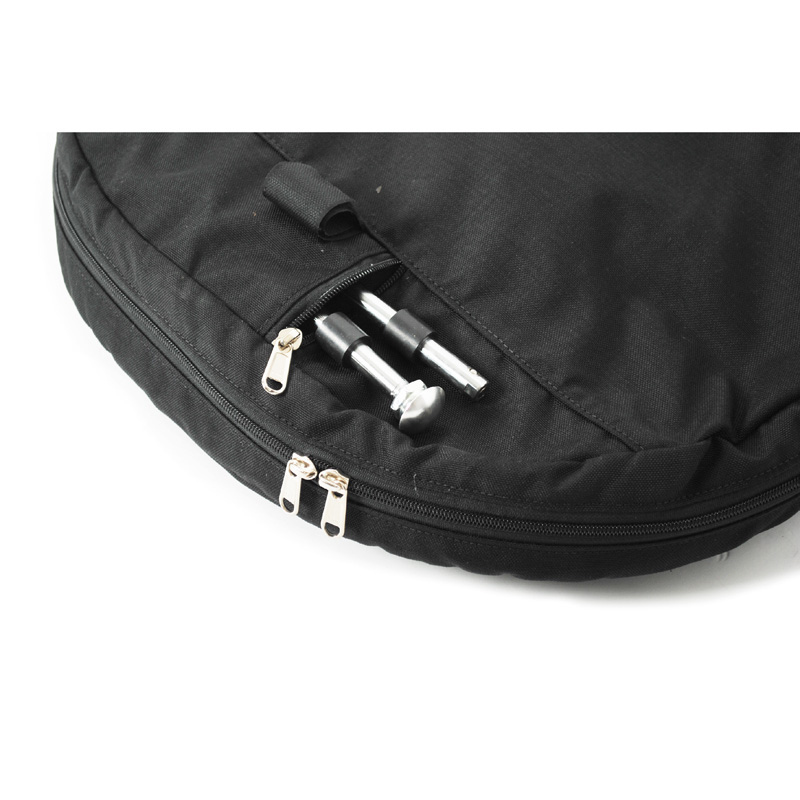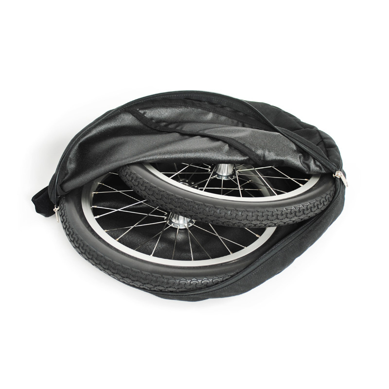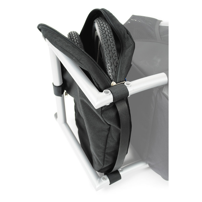 De wieltas kan gebruikt worden voor het meenemen van een reservewiel maar ook om de beide wielen in te doen als ze uit het frame gehaald zijn. De tas kan met de ingebouwde spanband aan het frame verbonden worden. Verder voorkomt de tas dat de wielen de rest van de bagage vies maakt, als ze samen opgeborgen worden.